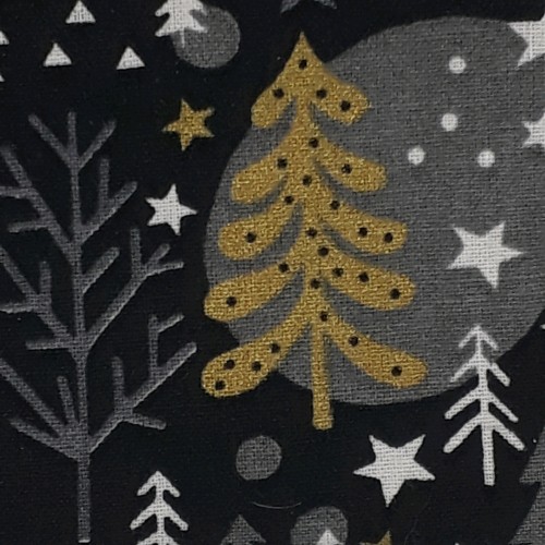 tissu coton noir imprimé sapins et étoiles tons gris, blanc et or,