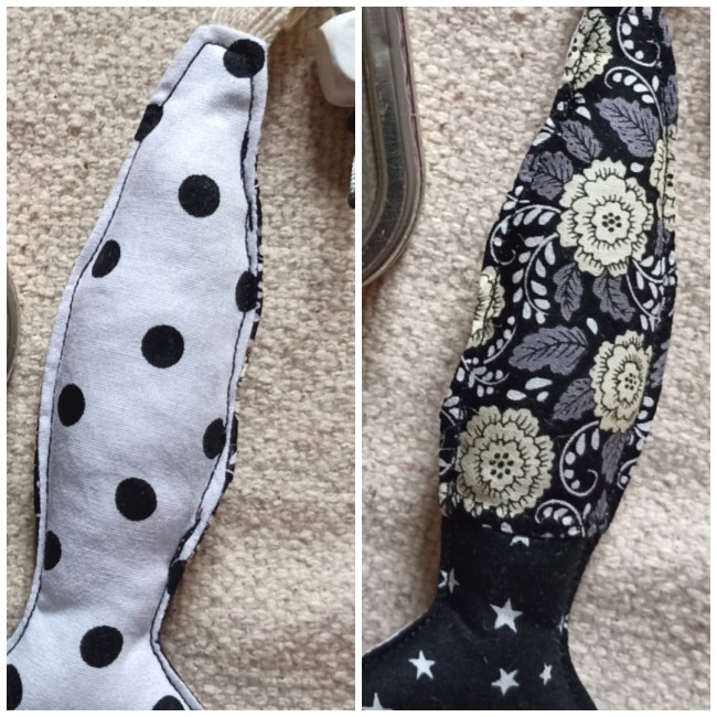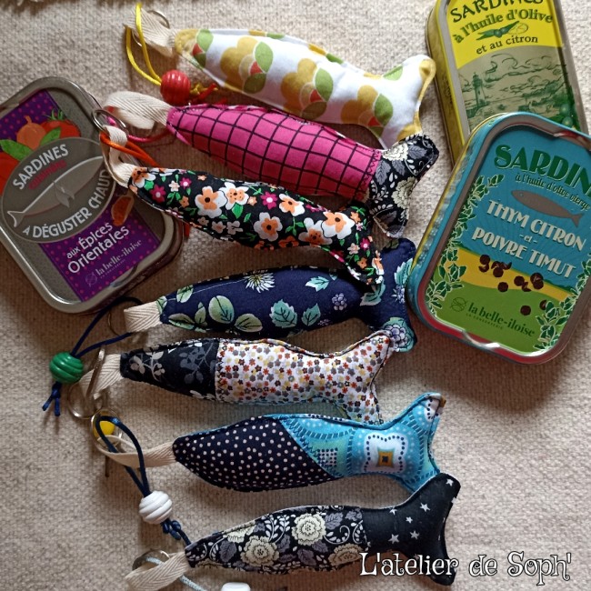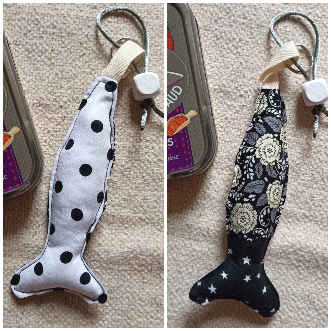 Ces petites sardines sont faites à partir de mes chutes de tissus, imprimé fleurs, pois, étoiles tons noir/blanc